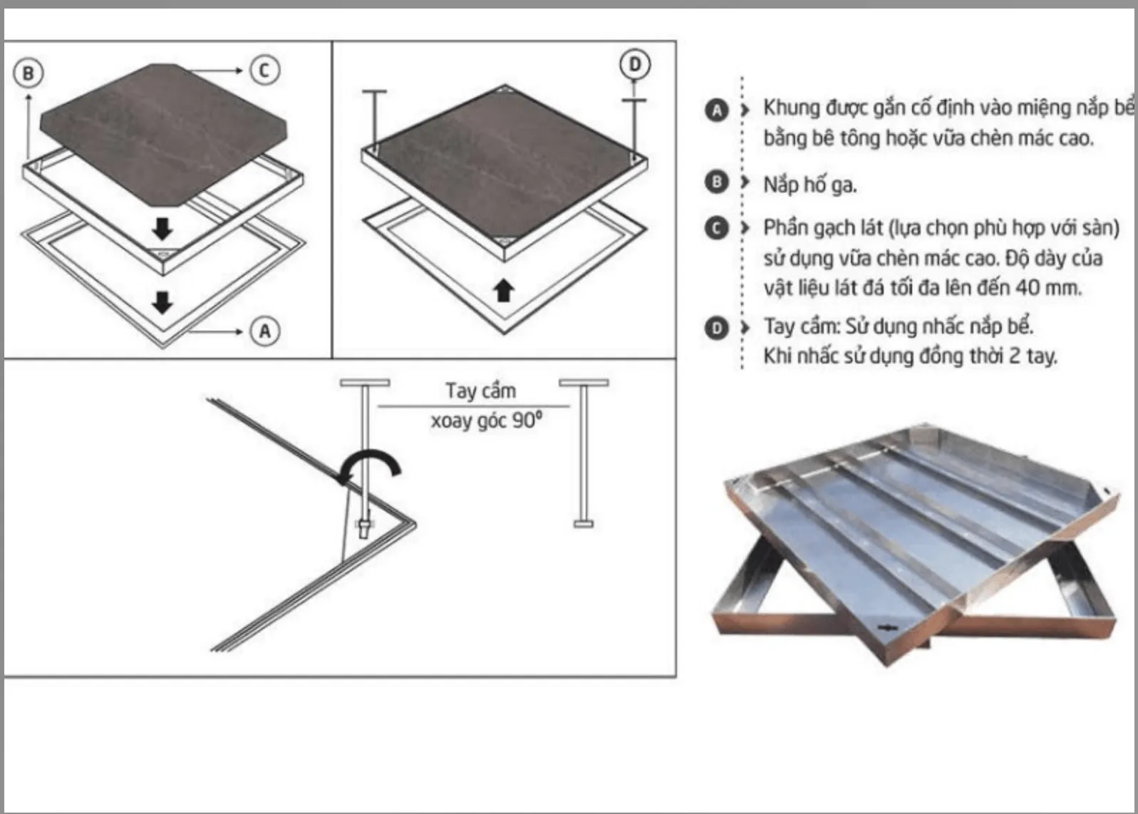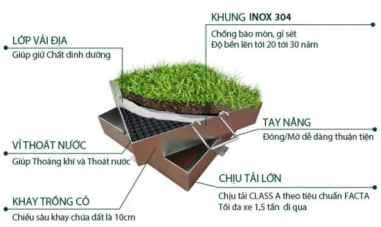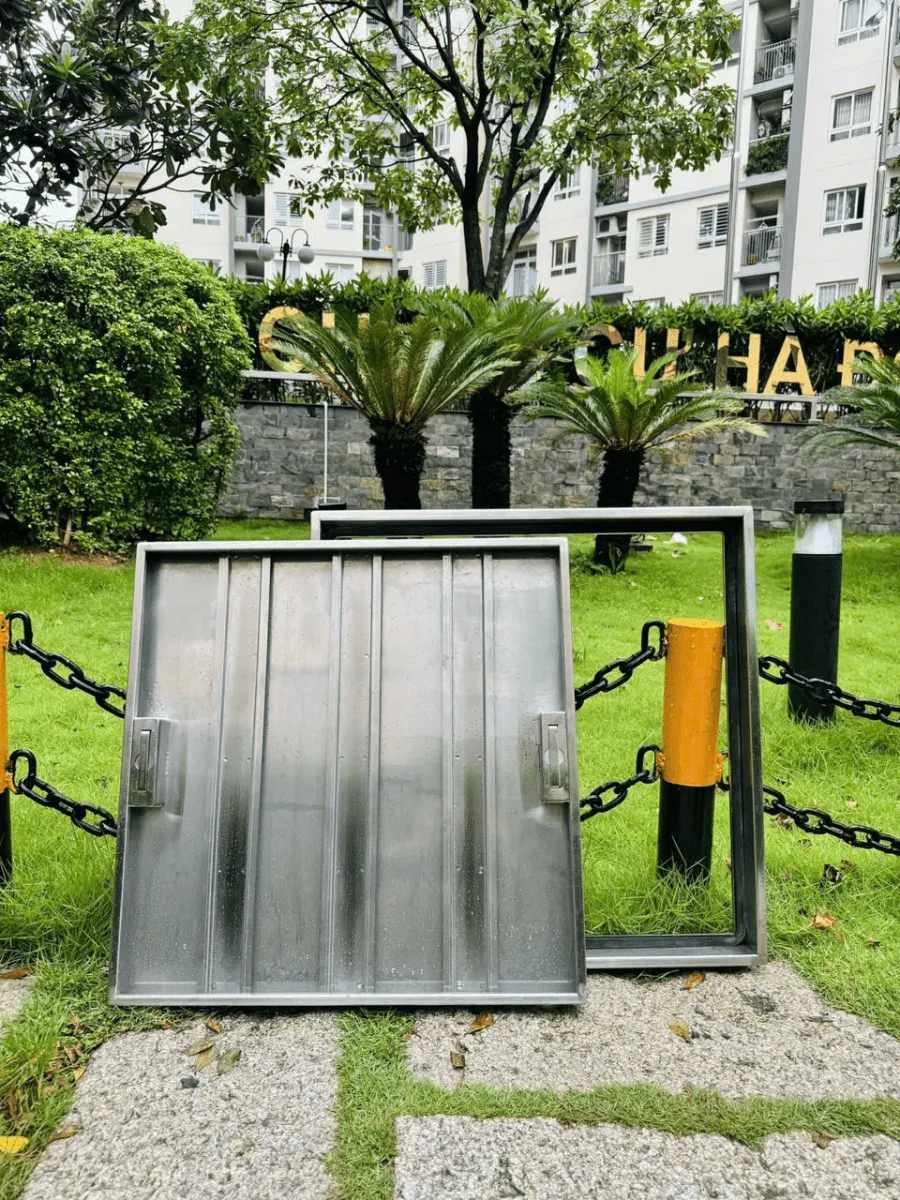 Phần khung đỡ phía dưới: được làm từ inox (SUS304/SUS201) hoặc thép tấm dày dặn, được hàn chắc chắn tạo thành một khung vuông hoặc chữ nhật vững chắc. Khung thường được hàn thêm các thanh móc thép hoặc tai cài để tăng khả năng bám dính, liên kết chặt chẽ vào lớp bê tông nền khi lắp đặt.